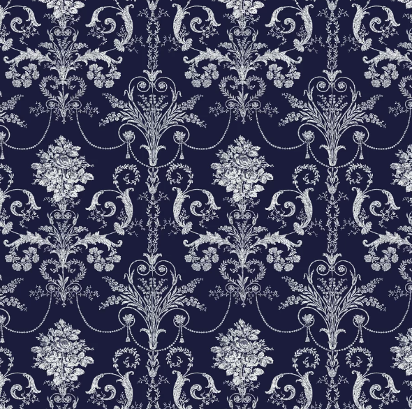 ローズブーケなどさまざまな花やタッセル、花綱装飾を優雅な曲線で描いたダマスク柄。