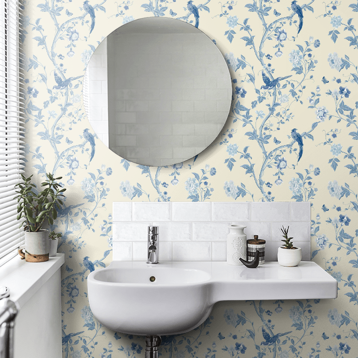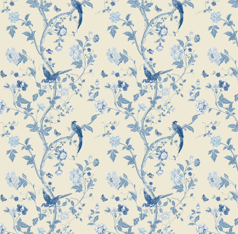 チャイニーズスタイルで描かれた樹木や鳥が特徴で、ナイチンゲールの花と蝶が枝を彩ります。