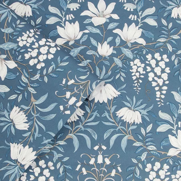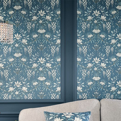 描かれているモチーフは、藤、カンパニュラ、リリーを思わせる白い花、なめらかな曲線を描く花々の茎。