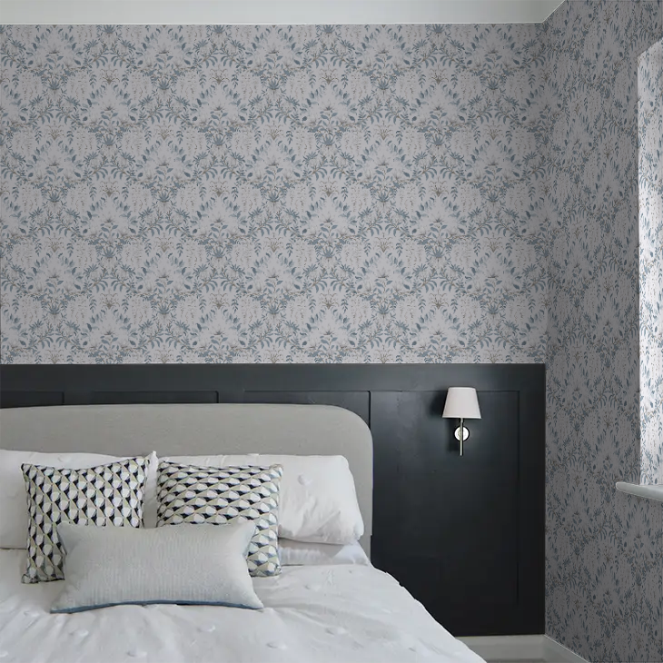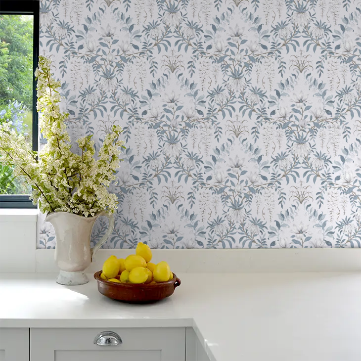 描かれているモチーフは、藤、カンパニュラ、リリーを思わせる白い花、なめらかな曲線を描く花々の茎。