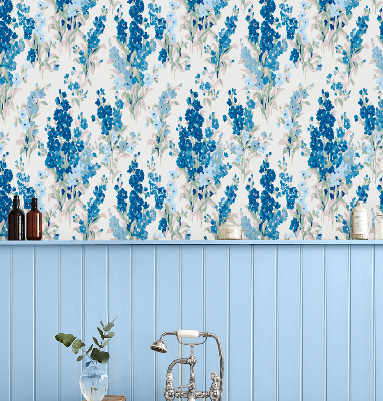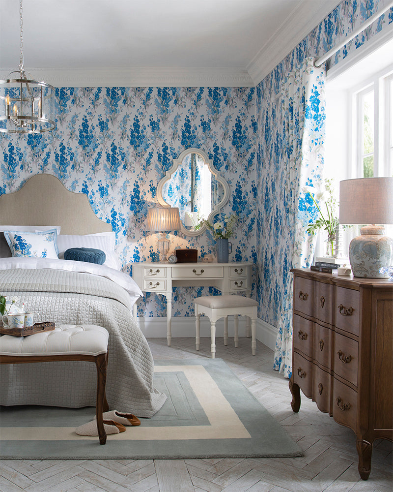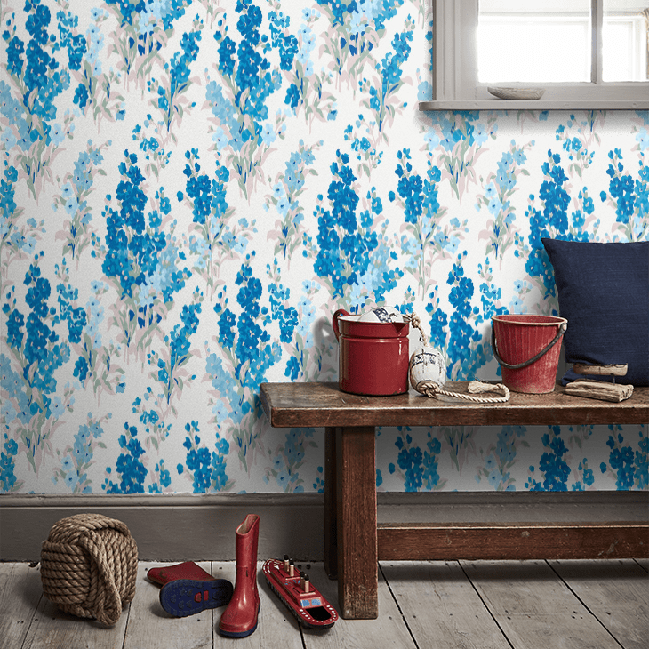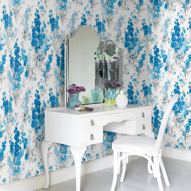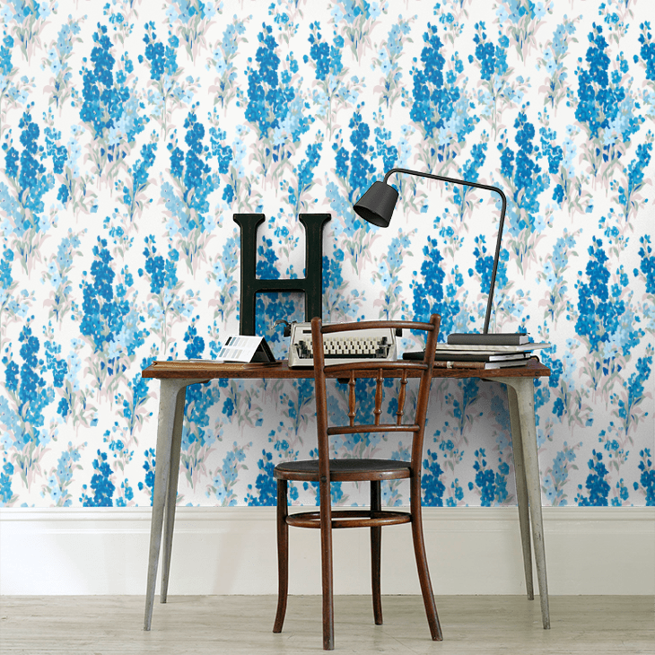 濃淡のブルーで描かれた大ぶりのストックが、空間を華やかかつ爽やかに演出します。