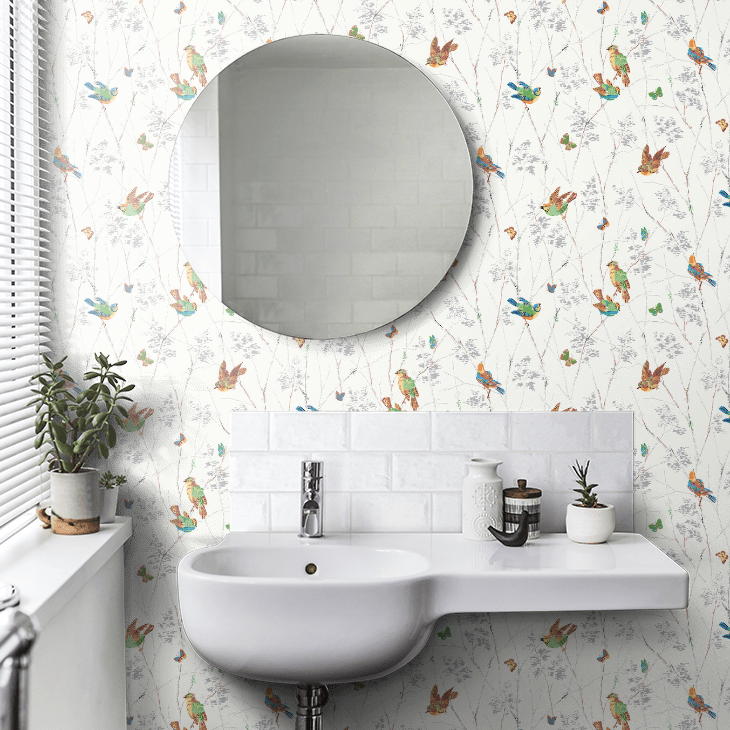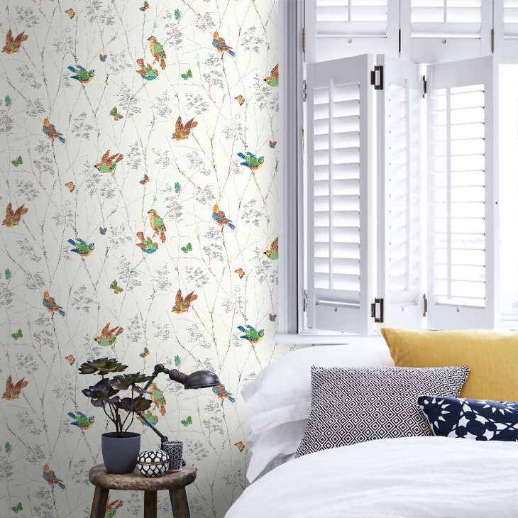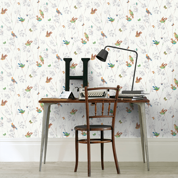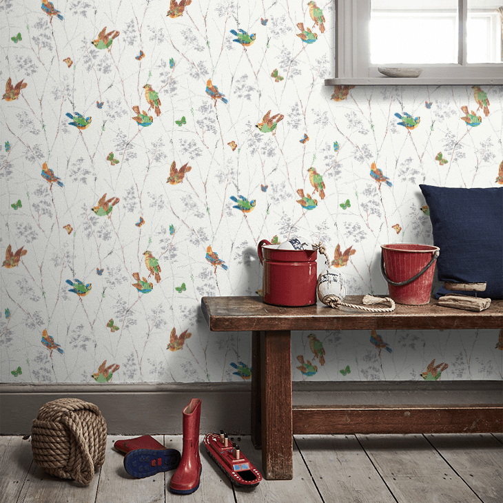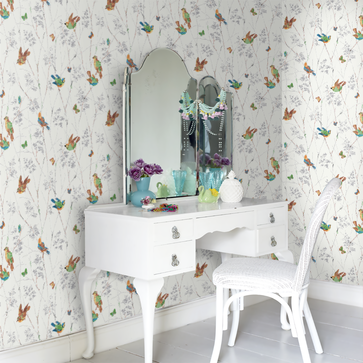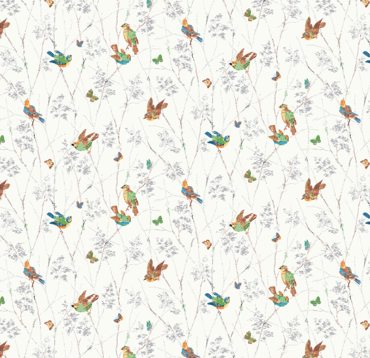 カラフルな鳥や蝶が枝から枝へと飛び回る陽気なデザインです。