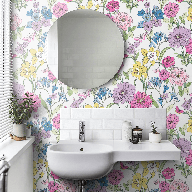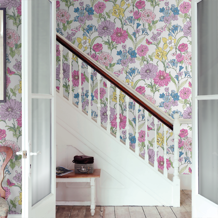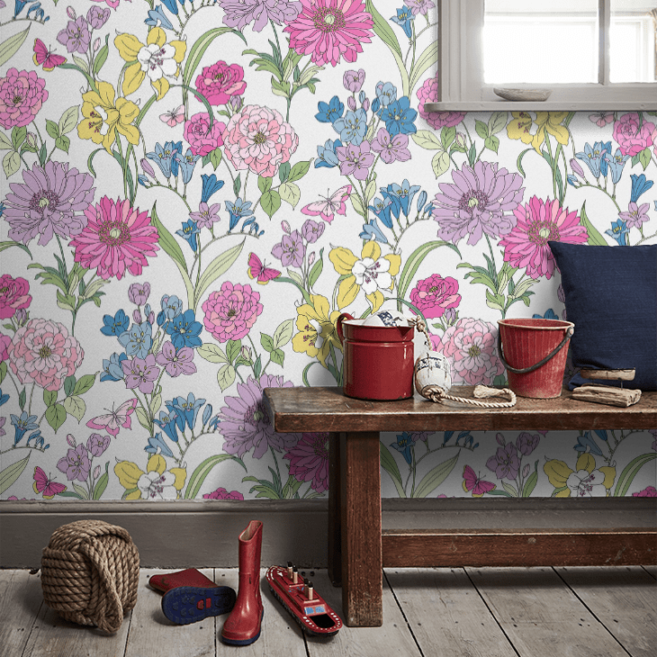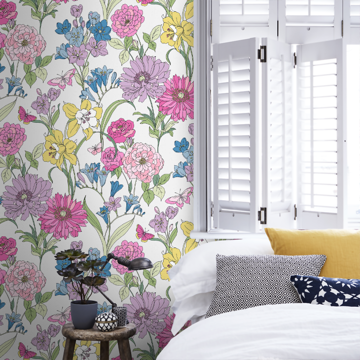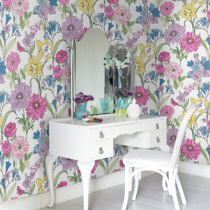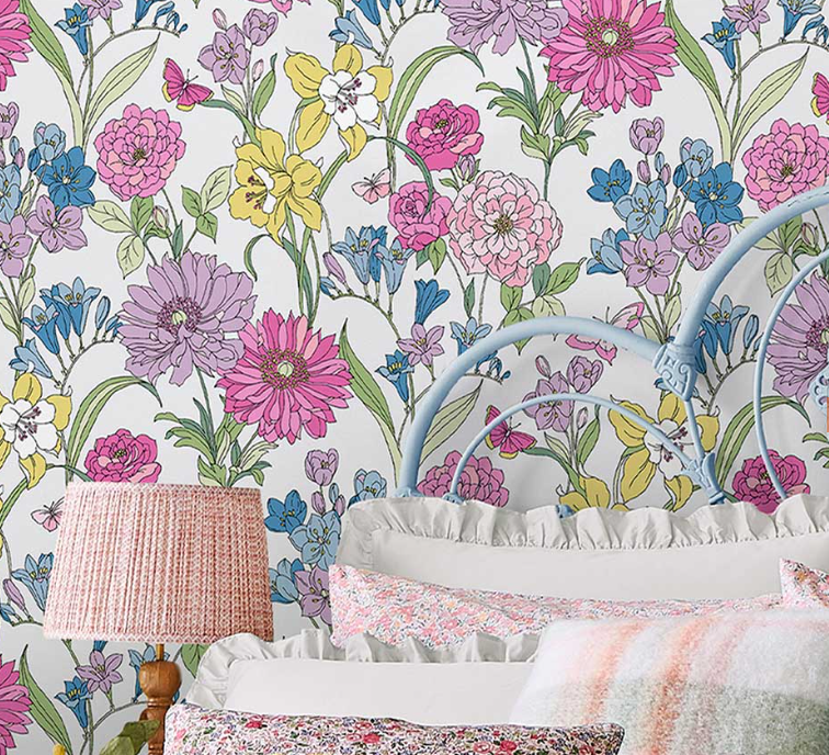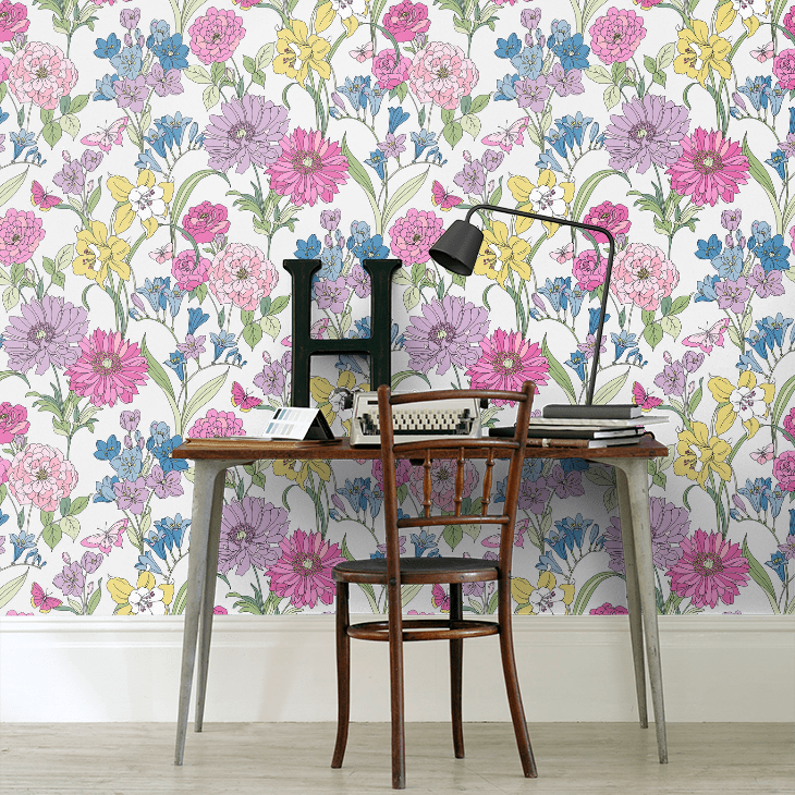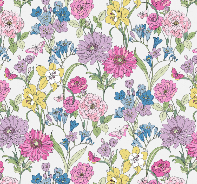 百日草、ダリア、マリーゴールド、フリージアの花をあしらった、大きな花と蝶のデザイン全体に、大胆で鮮やかなポップなカラーが施されています。