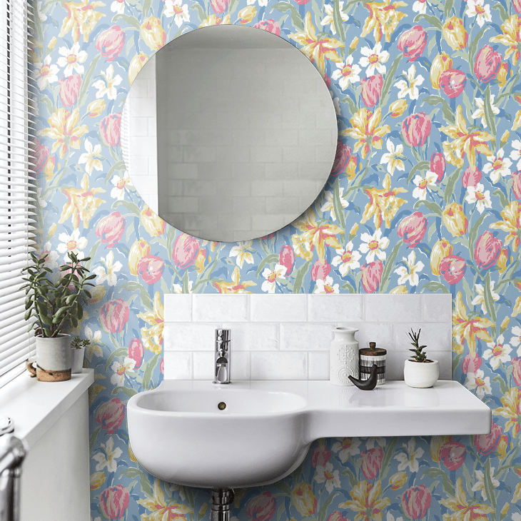 ブルーの背景にチューリップと水仙の大胆な春の花で、一日の始まりに最適です。
