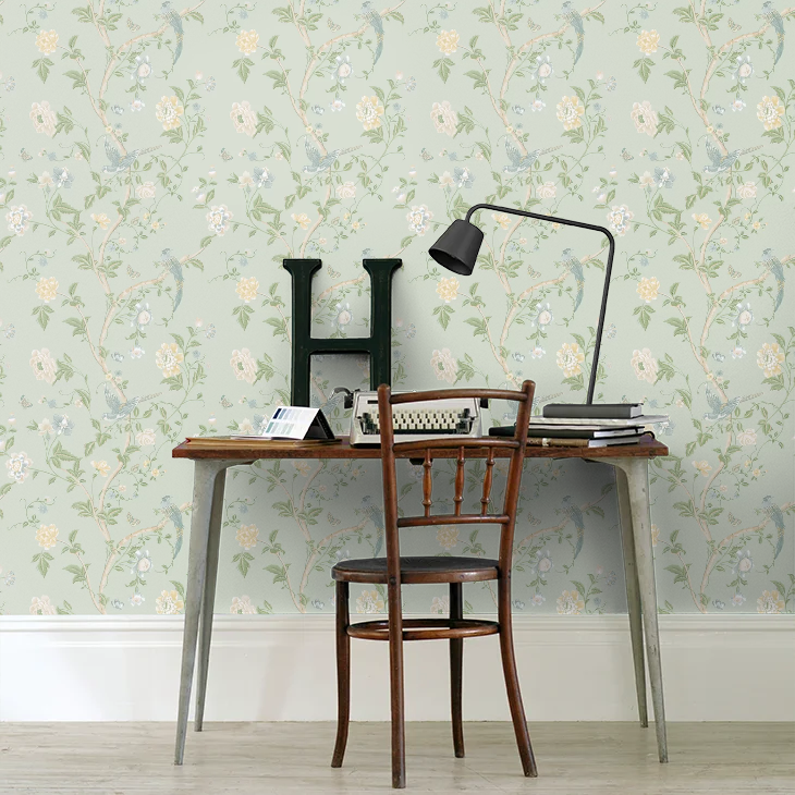 チャイニーズスタイルで描かれた樹木や鳥が特徴で、ナイチンゲールの花と蝶が枝を彩ります。