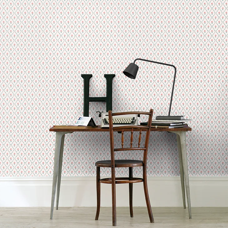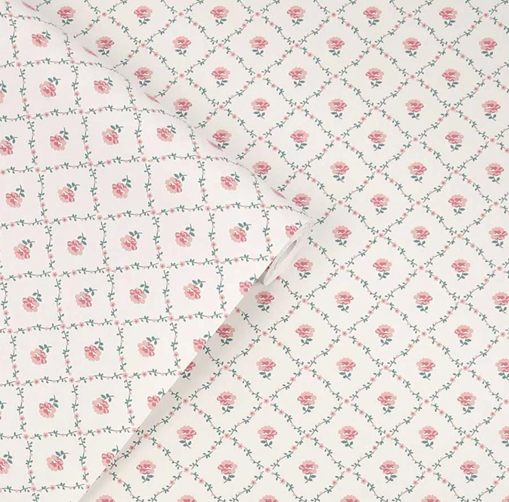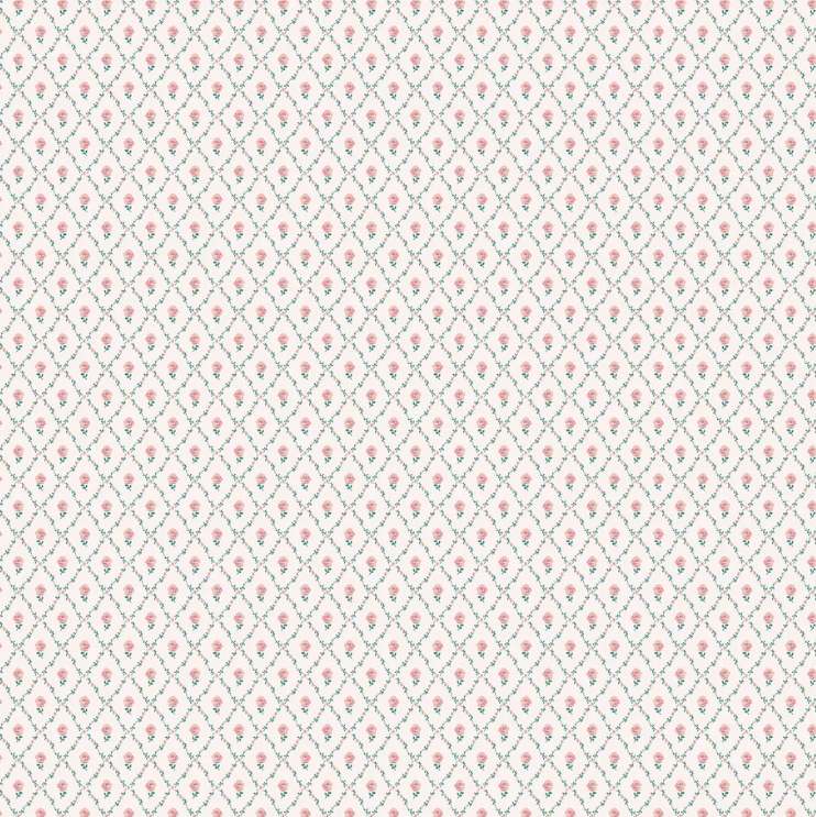 かわいらしい小さな葉でダイヤモンド型のトレリスを形成し、中央にバラの花が咲いた、伝統的なカントリーデザインです。