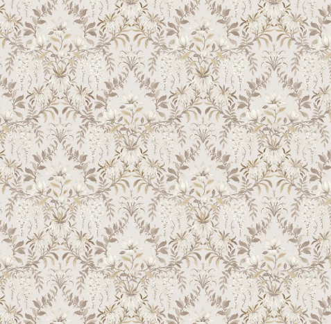 描かれているモチーフは、藤、カンパニュラ、リリーを思わせる白い花、なめらかな曲線を描く花々の茎。