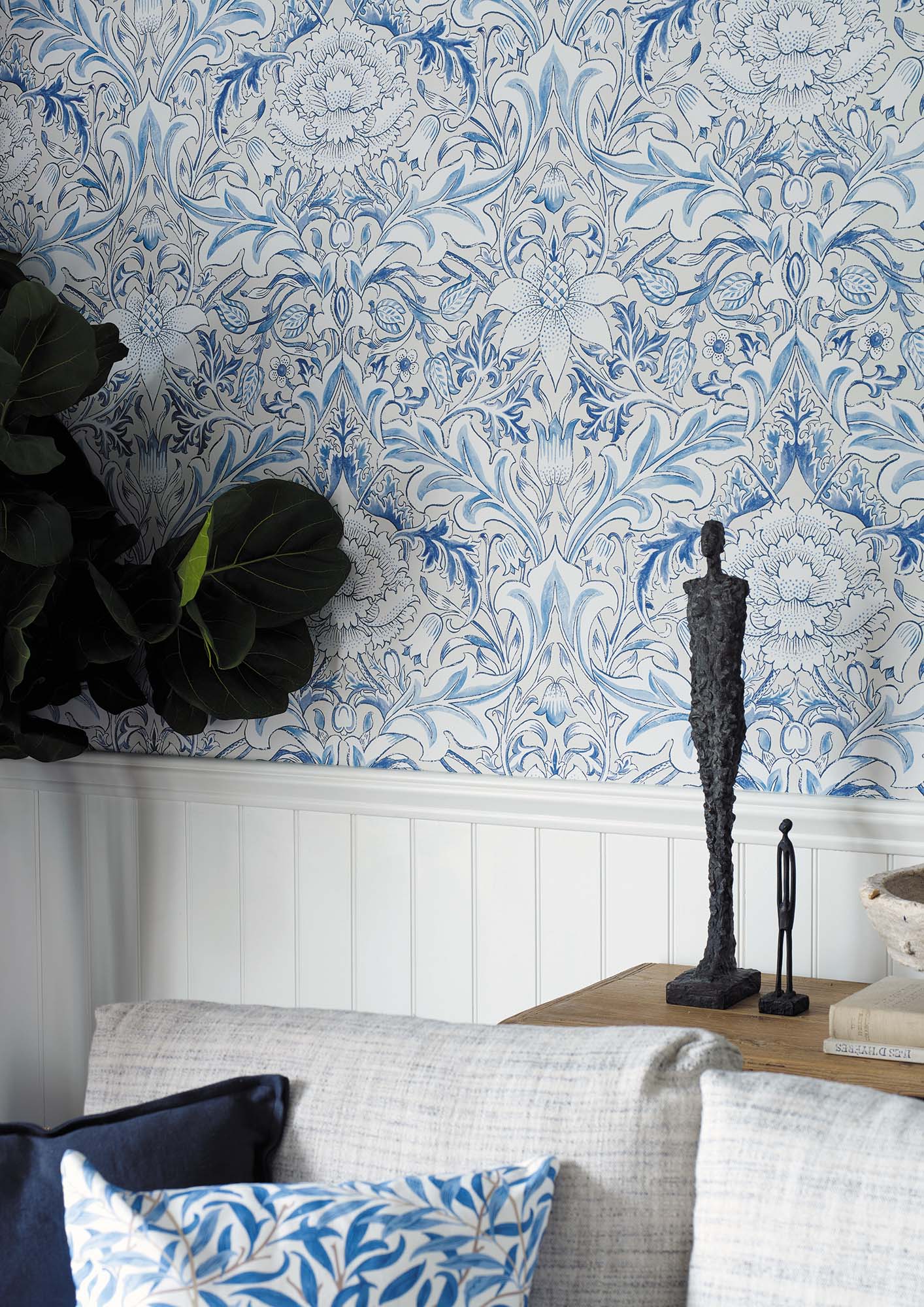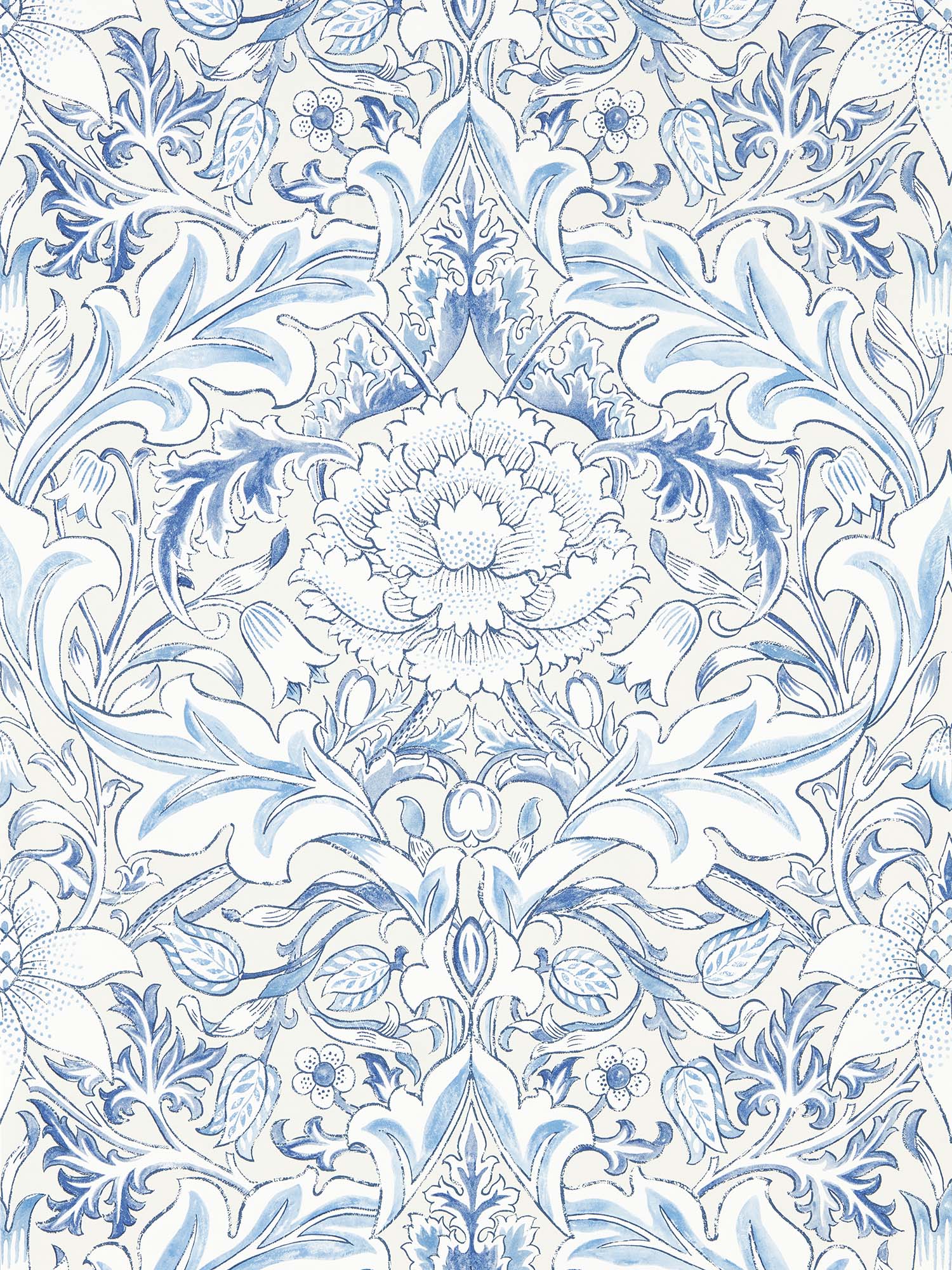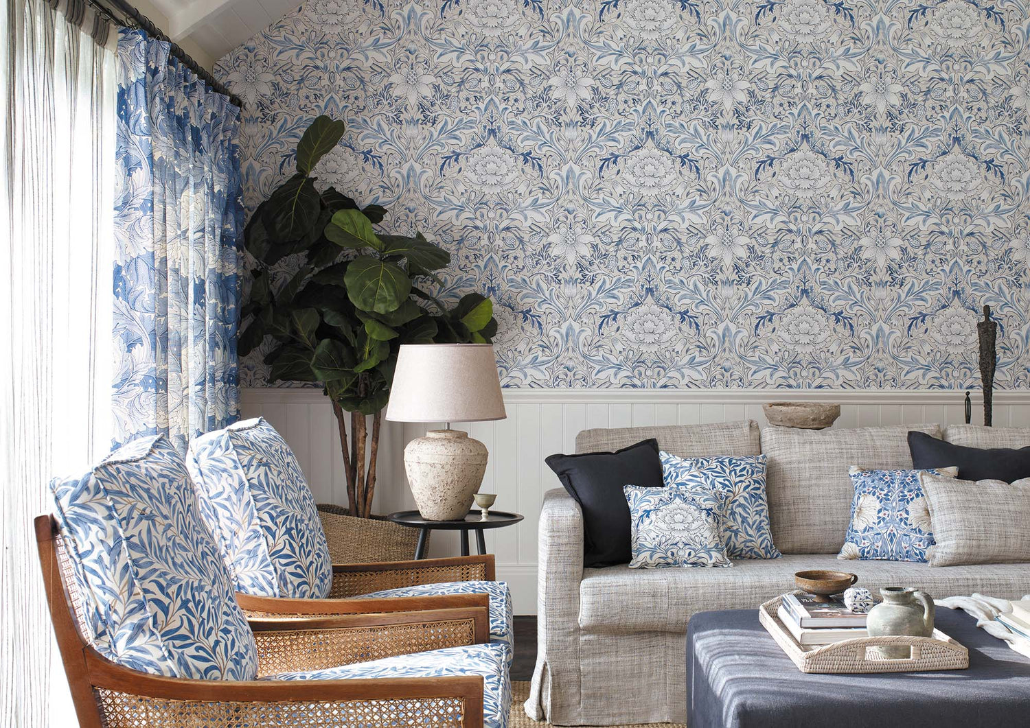 1887年から1890年ごろにジョン・ヘンリー・ダールによってデザインされ、サウスロンドンのマートンアビー工場で印刷されたものがオリジナル。月桂樹の葉が作るエレガントなダマスク模様のこのデザインですが、「SIMLY MORRIS」コレクションではじめてMORRIS&Co.のラインナップに加わりました。グレイッシュなトーンの壁紙(217076)がもともとの色合いに近いと言われています。